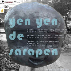 Yenyen de Sarapen, premiered in Karnabal Festival 2015. YDS, the first independent mascot, has performed in Zürcher Theater Spektakel (Zurich, Switzerland), and Asia TOPA Festival XO State Dark (Melbourne, Australia), and NEOFilipinos: 15 Minutes of Your Time and Pasinaya Festival (CCP). Sailor Yenyen was exhibited in Almost There at the University of the Philippines Vargas Museum curated by Patrick Flores with The Japan Foundation, Manila.